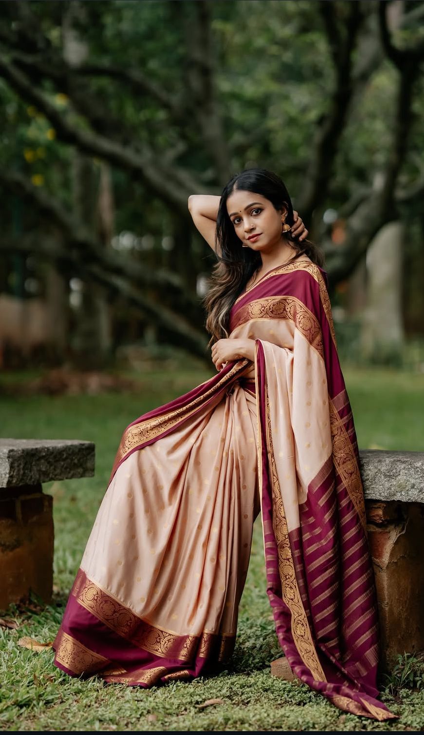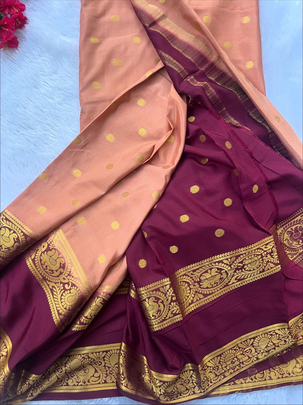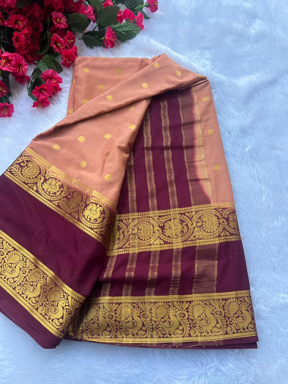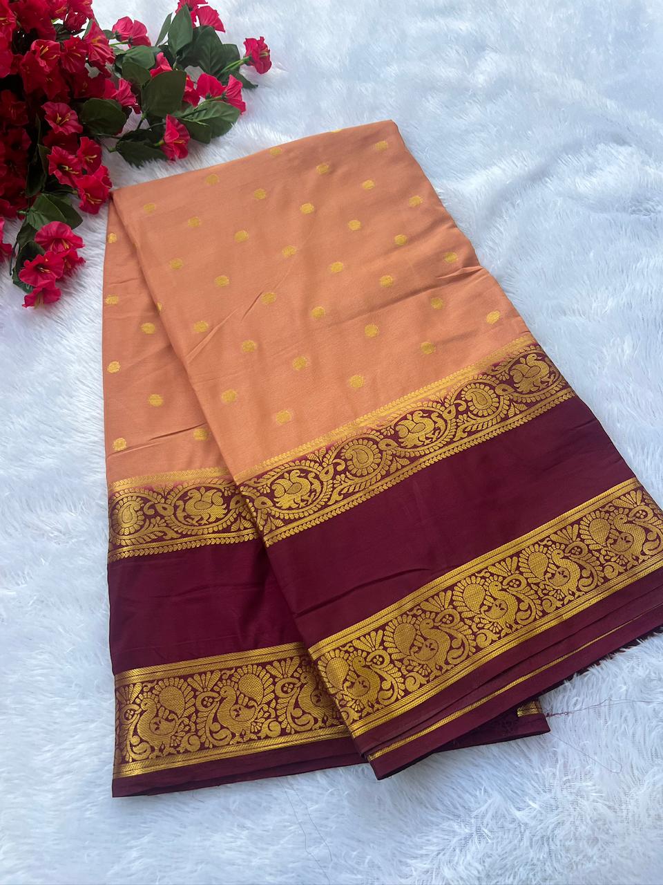 Elegant crape saree adorned with bentex butta design in a graceful peach and wine colour combination. The saree features a beautiful chit pallu and comes with a contrast butta blouse, adding a touch of sophistication and style. Perfect for festive and occasional wear. Care: Dry clean only.