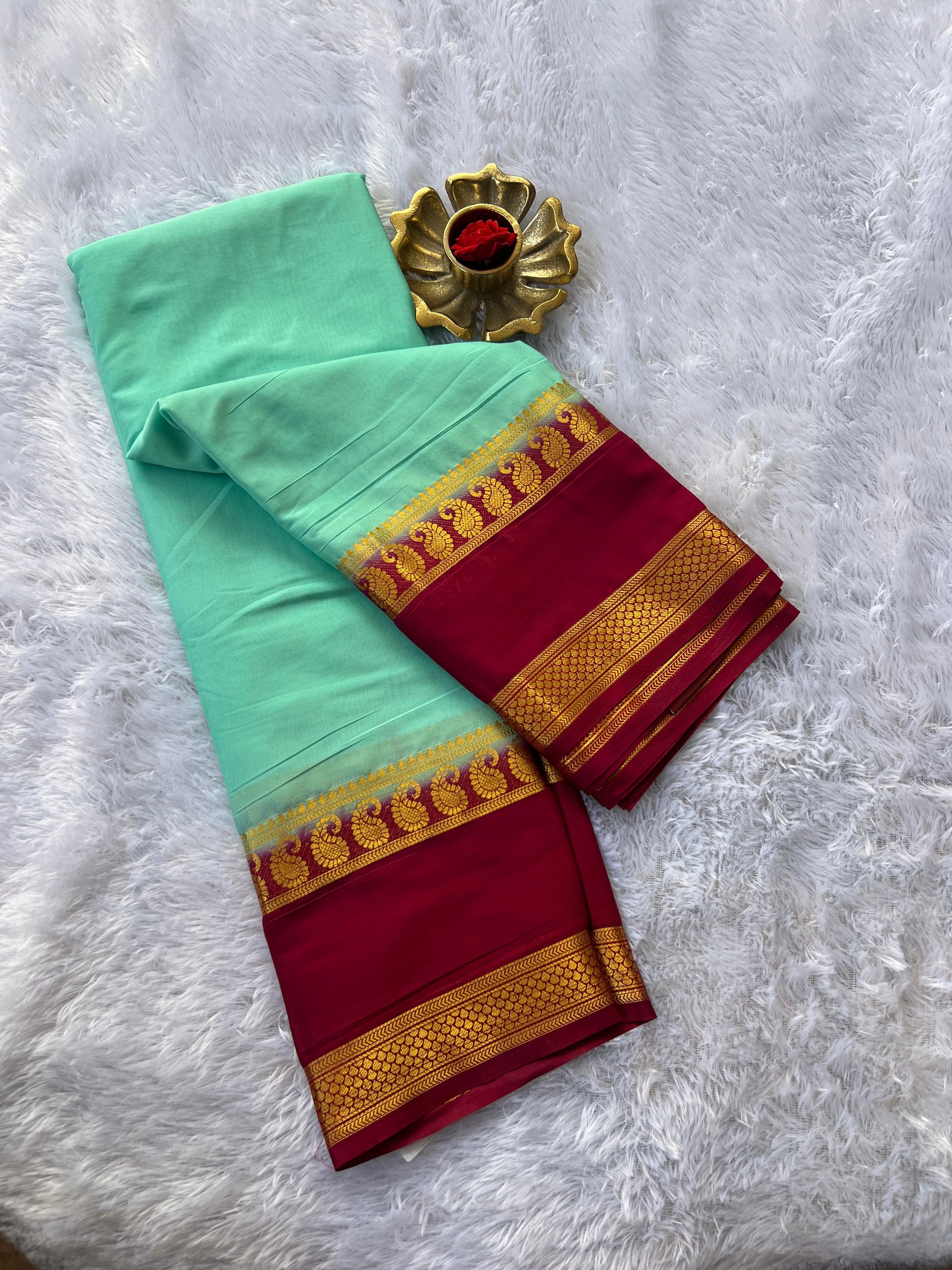 Graceful semi Mysore silk saree adorned with elegant mango bentex motifs in beautiful colour shades. The saree features a charming chit pallu and comes with a contrast plain blouse, adding a touch of sophistication. Care: Dry wash only.