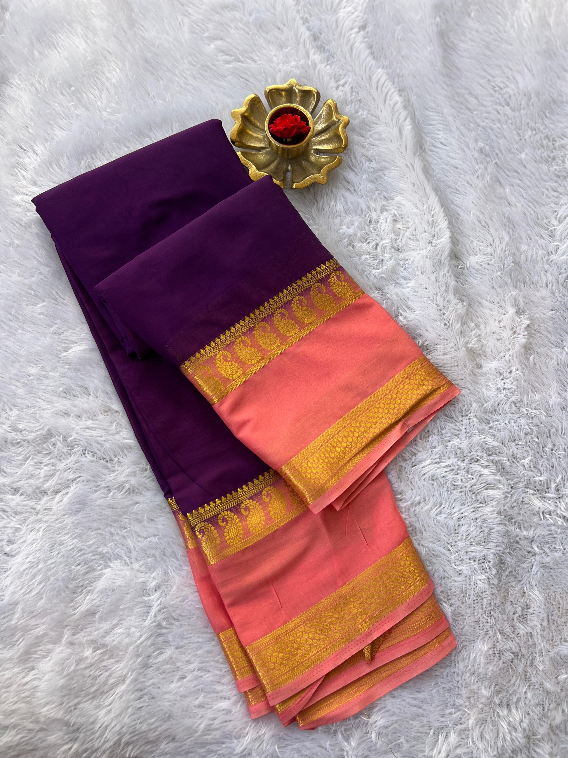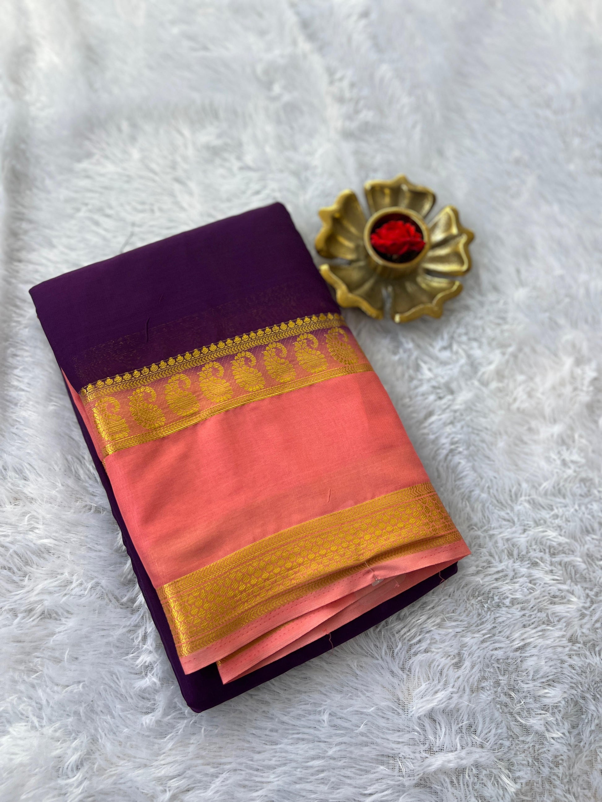 Graceful semi Mysore silk saree adorned with elegant mango bentex motifs in beautiful colour shades. The saree features a charming chit pallu and comes with a contrast plain blouse, adding a touch of sophistication. Care: Dry wash only.