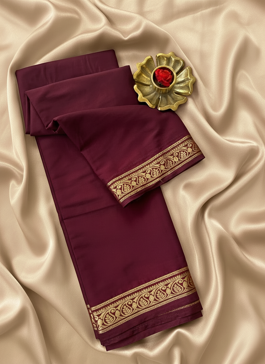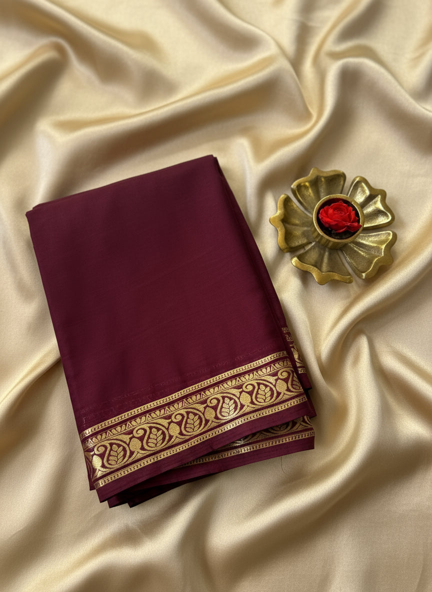 Elevate your ethnic wardrobe with our premium Semi Mysore Silk Saree, crafted as a pure replica of KSIC Mysore Silk Tarry. This beautiful drape features a small-to-medium mango border, adding a touch of traditional elegance to its soft and smooth texture. The saree offers a graceful fall, luxurious sheen, and a refined finish, making it perfect for festive occasions and special events.