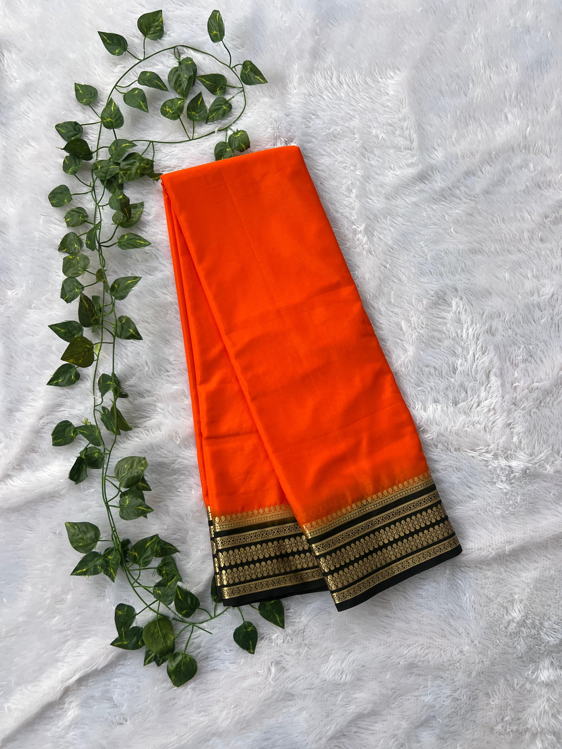Elegant crepe saree designed as a replica of pure Mysore silk, crafted with 100 GSM in orange and Dark bottel green colour premium fabric for a smooth and graceful drape. It features a medium contrast border that enhances its traditional charm. Comes with a matching blouse piece. Dry wash only recommended to maintain the fabric’s shine and texture.