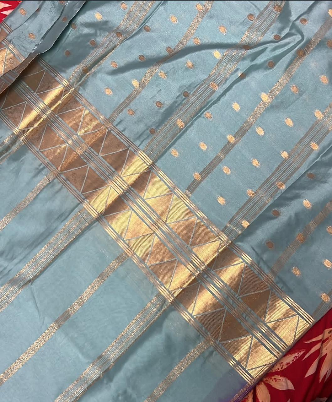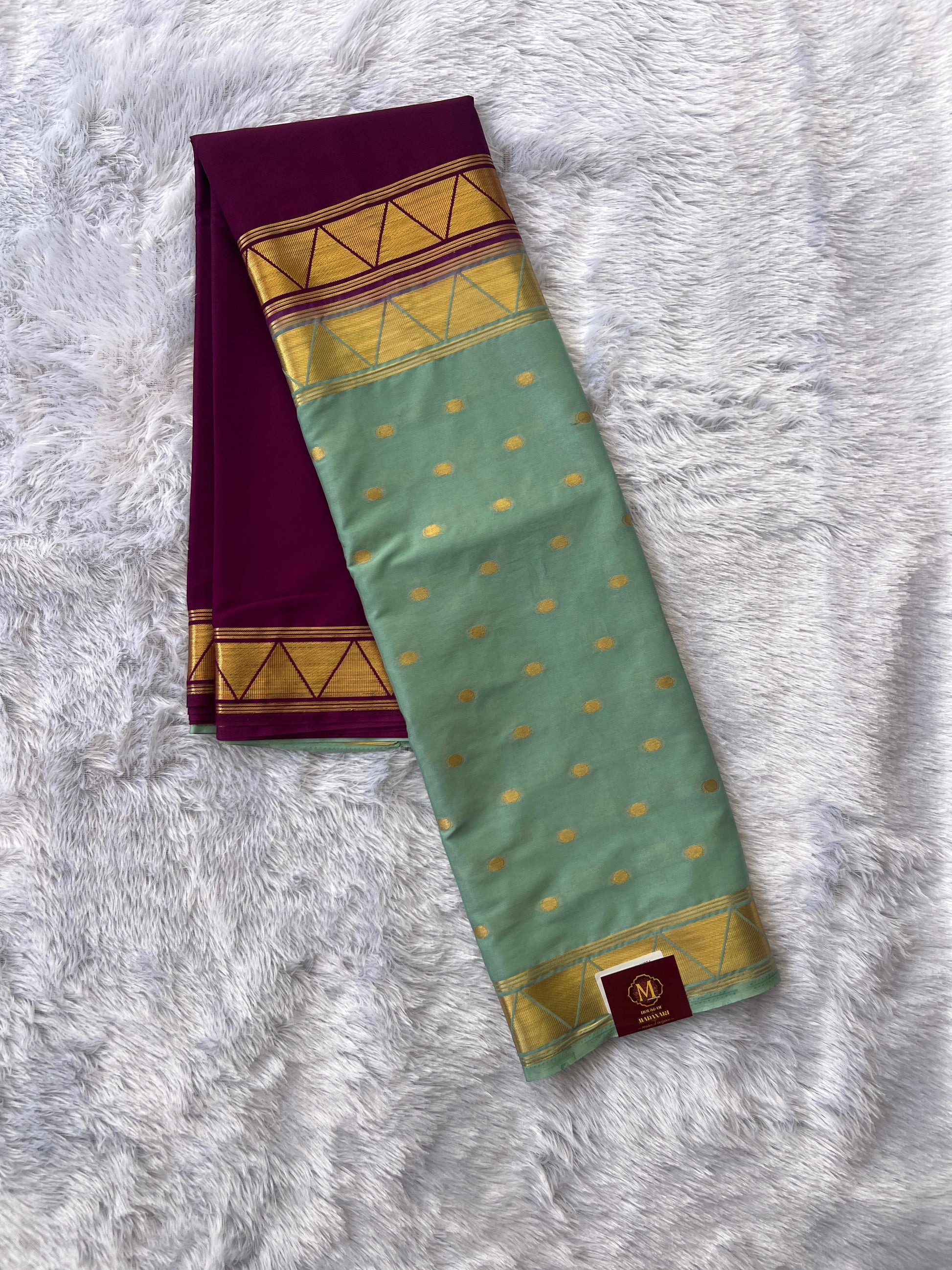 Stylish half and half saree in semi Mysore silk, adorned with elegant butta weaving. It features a graceful chit pallu and comes with a contrast blouse, perfectly blending tradition with modern charm. Care: Dry clean only.