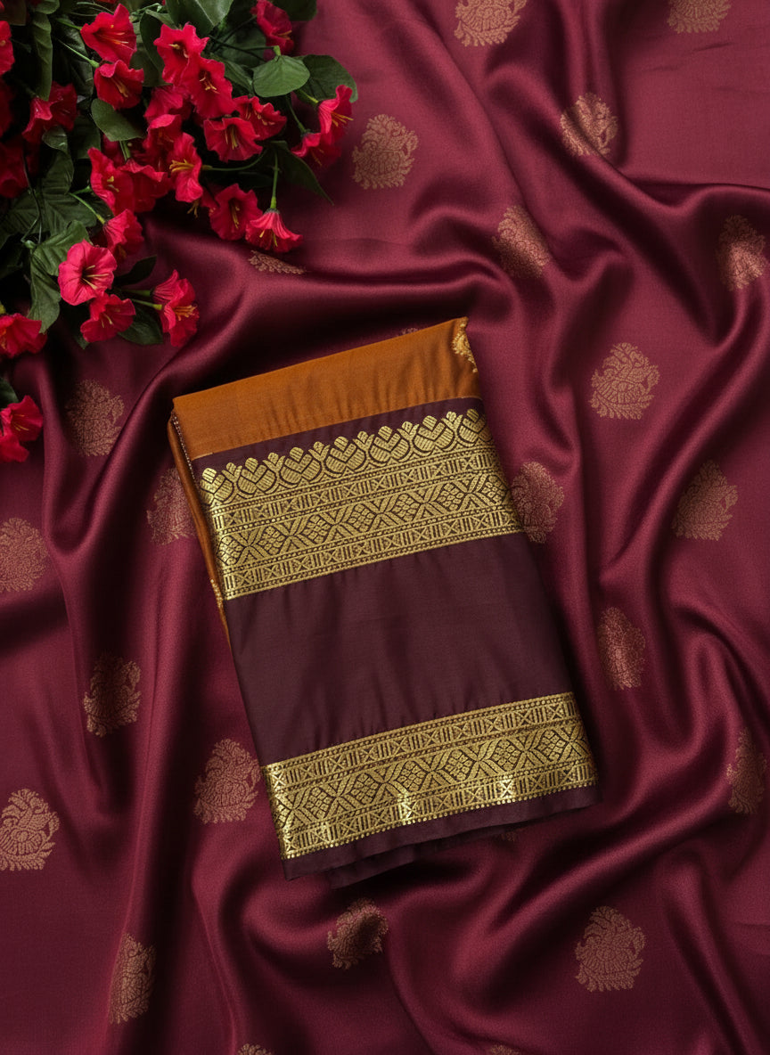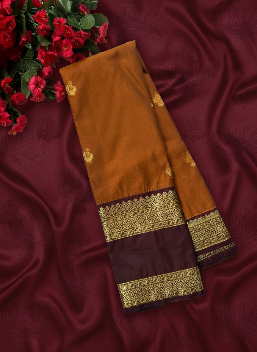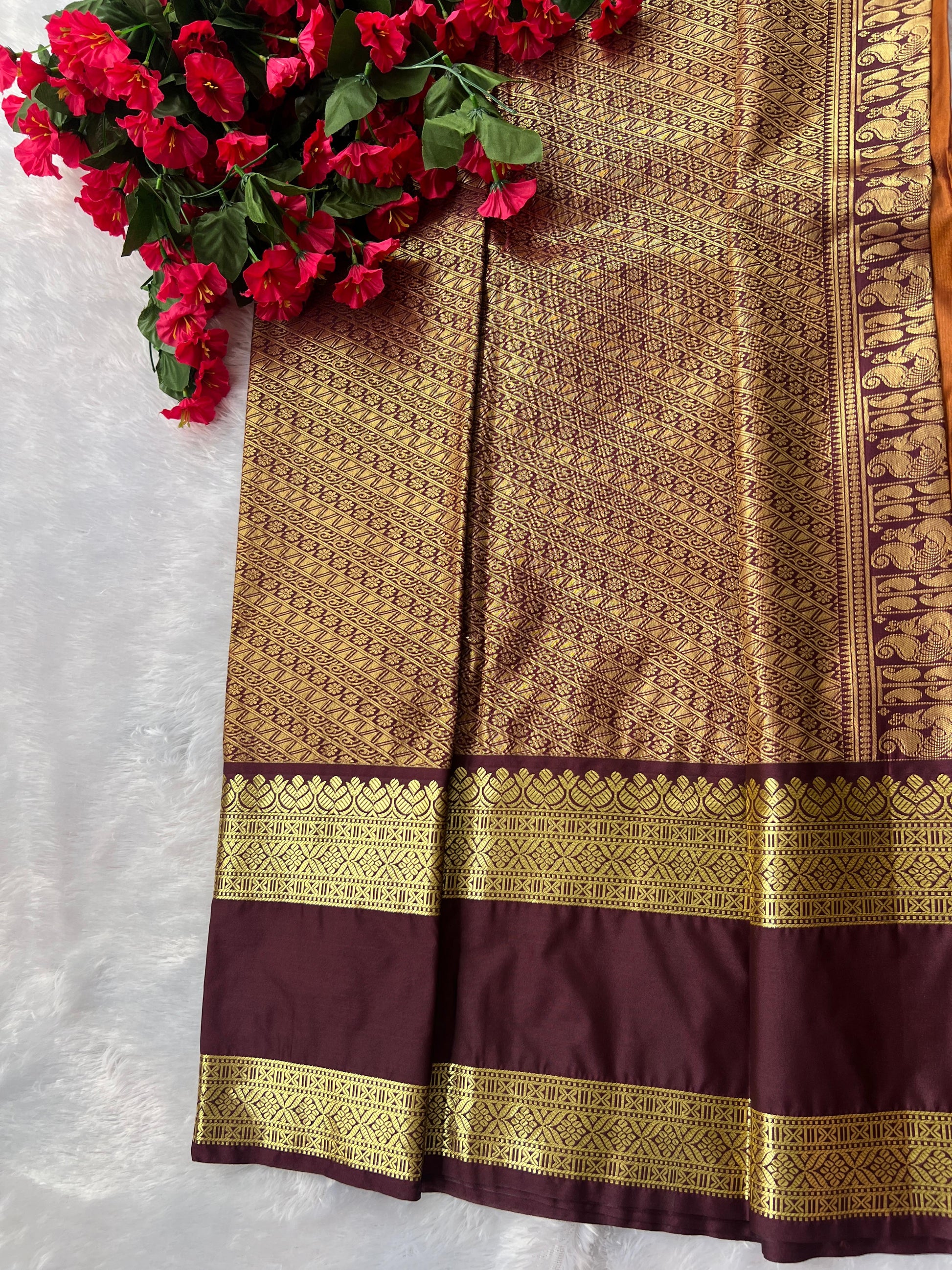 “Rust orange elegance in semi Kanchi with rich pallu magic ✨”