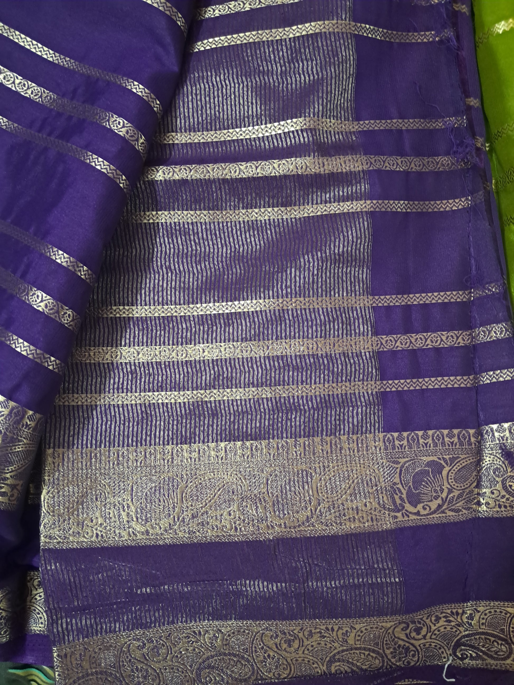 Charming semi Mysore silk saree in a beautiful parrot green shade, adorned with elegant stripe patterns. The saree features a classic bentex border and a striking purple contrast design that adds rich elegance. It comes with a matching striped blouse and a graceful chit pallu, making it perfect for festive and special occasions. Care: Dry clean only.