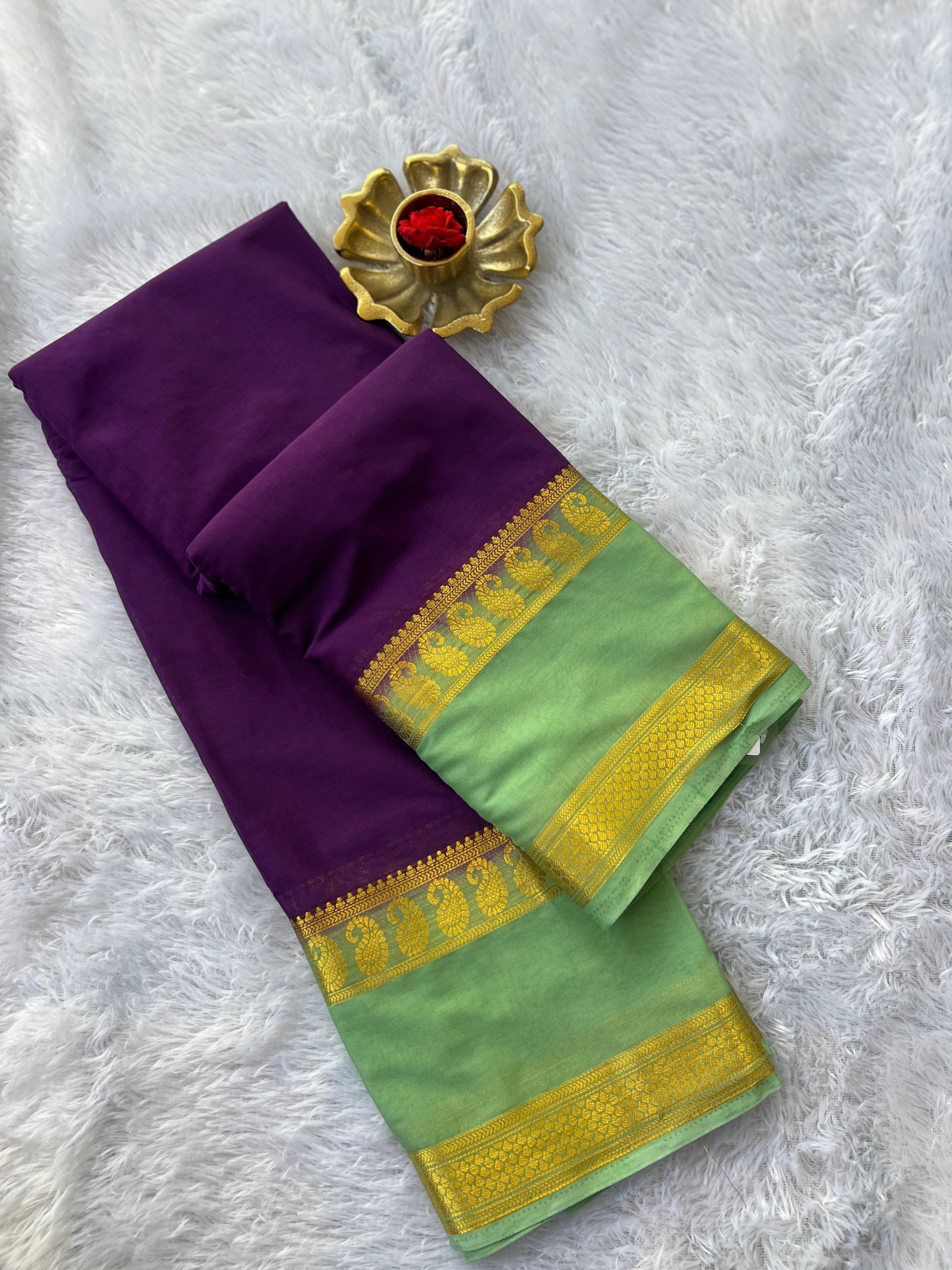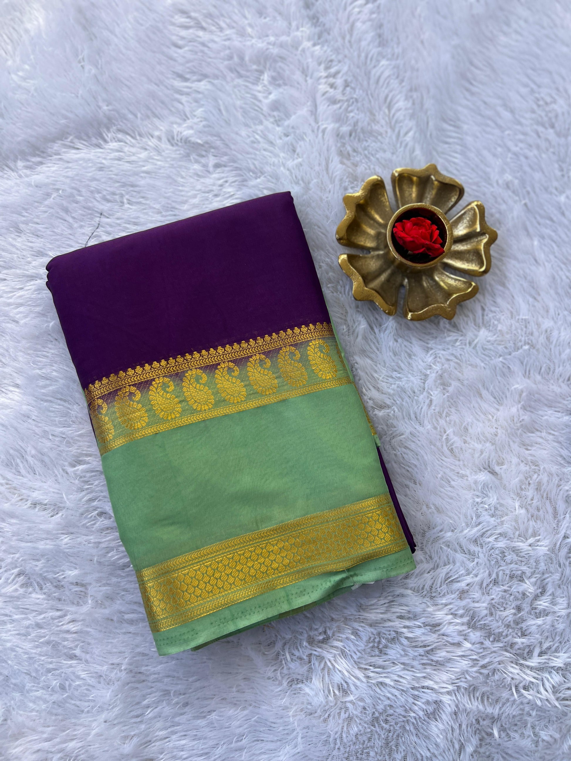 Graceful semi Mysore silk saree adorned with elegant mango bentex motifs in beautiful colour shades. The saree features a charming chit pallu and comes with a contrast plain blouse, adding a touch of sophistication. Care: Dry wash only.