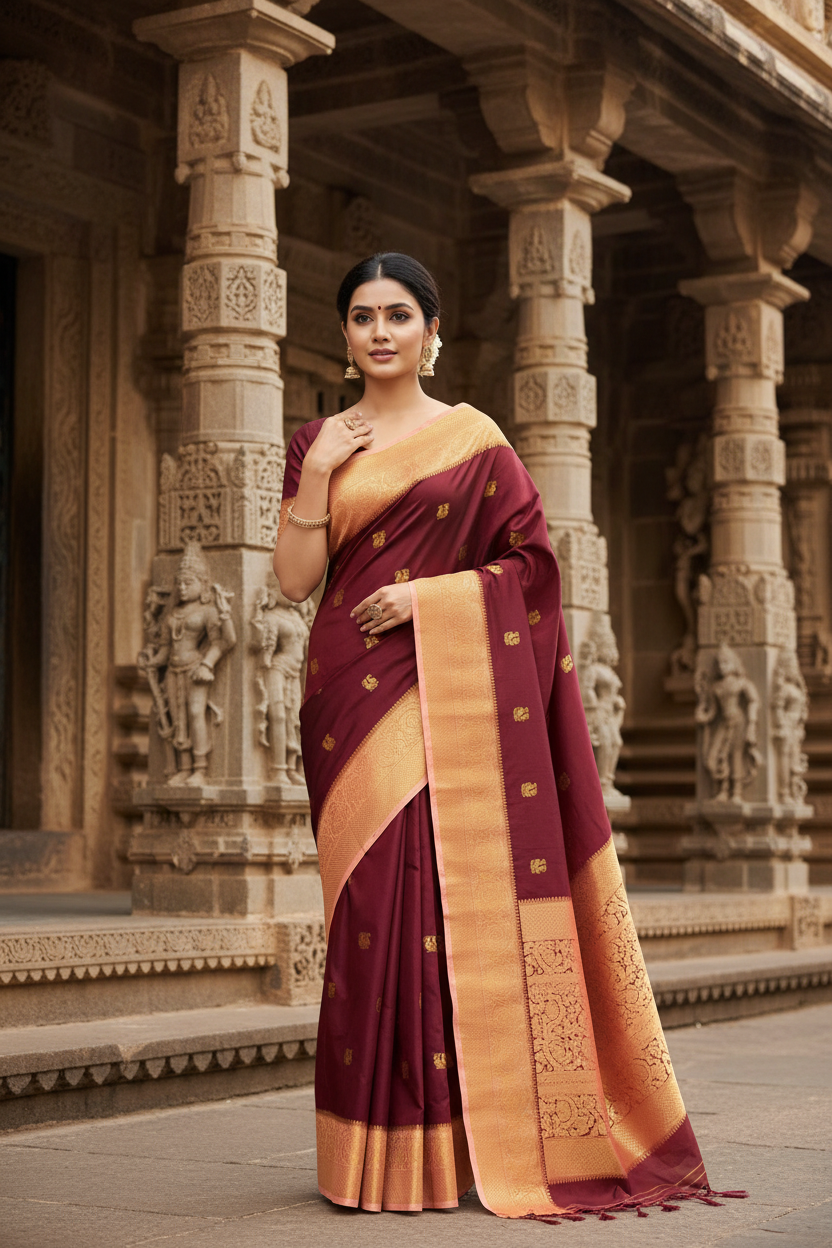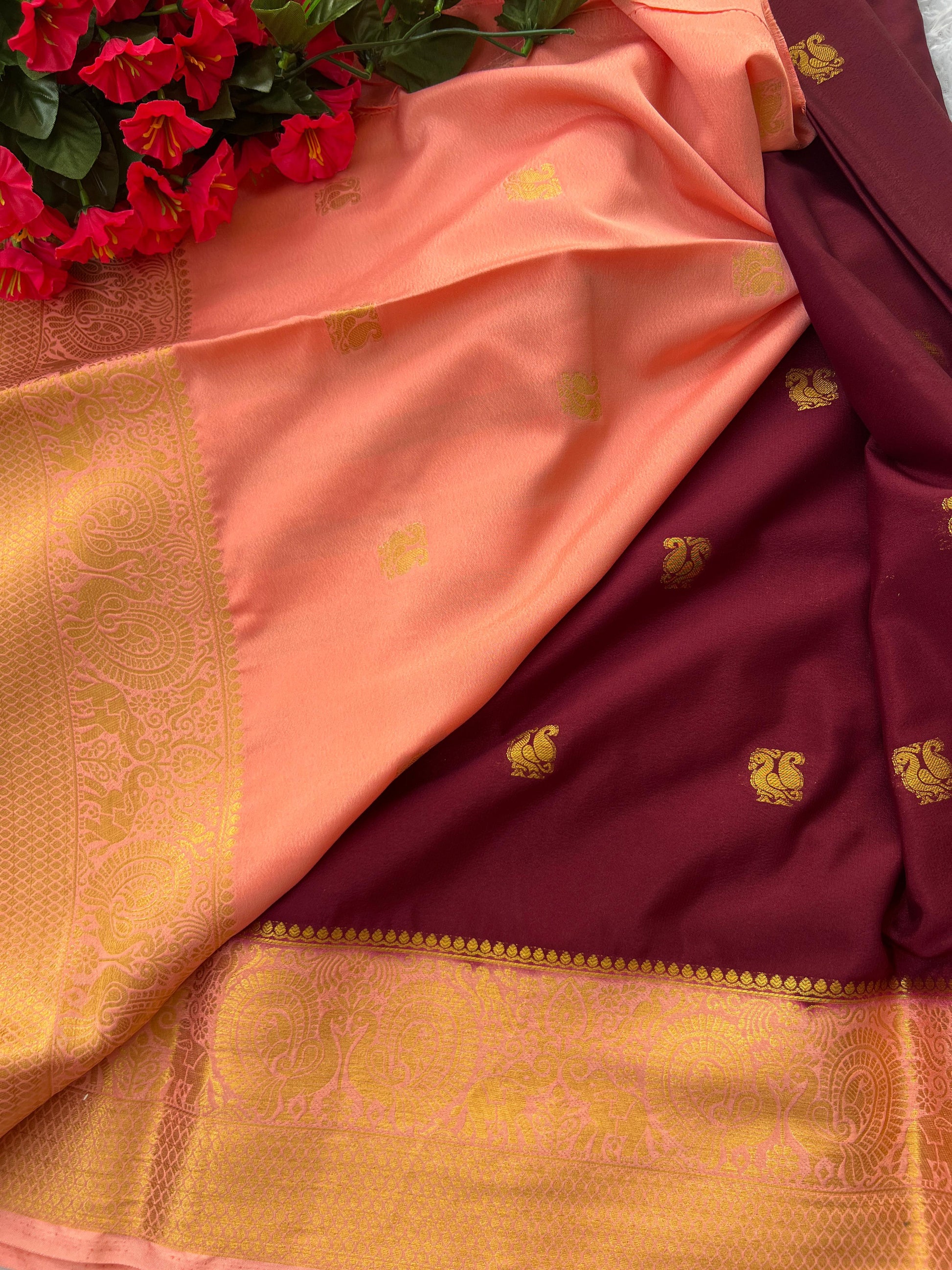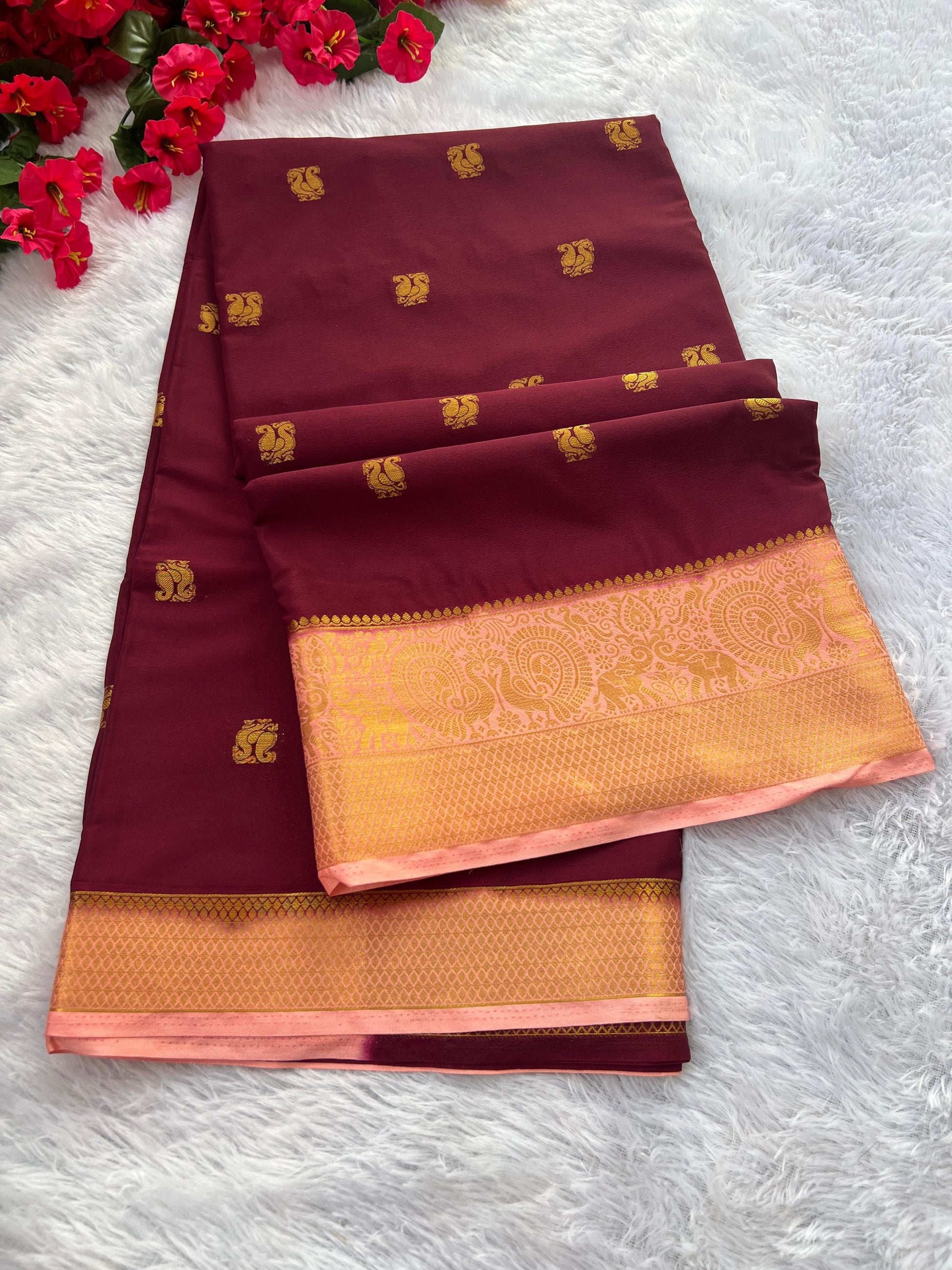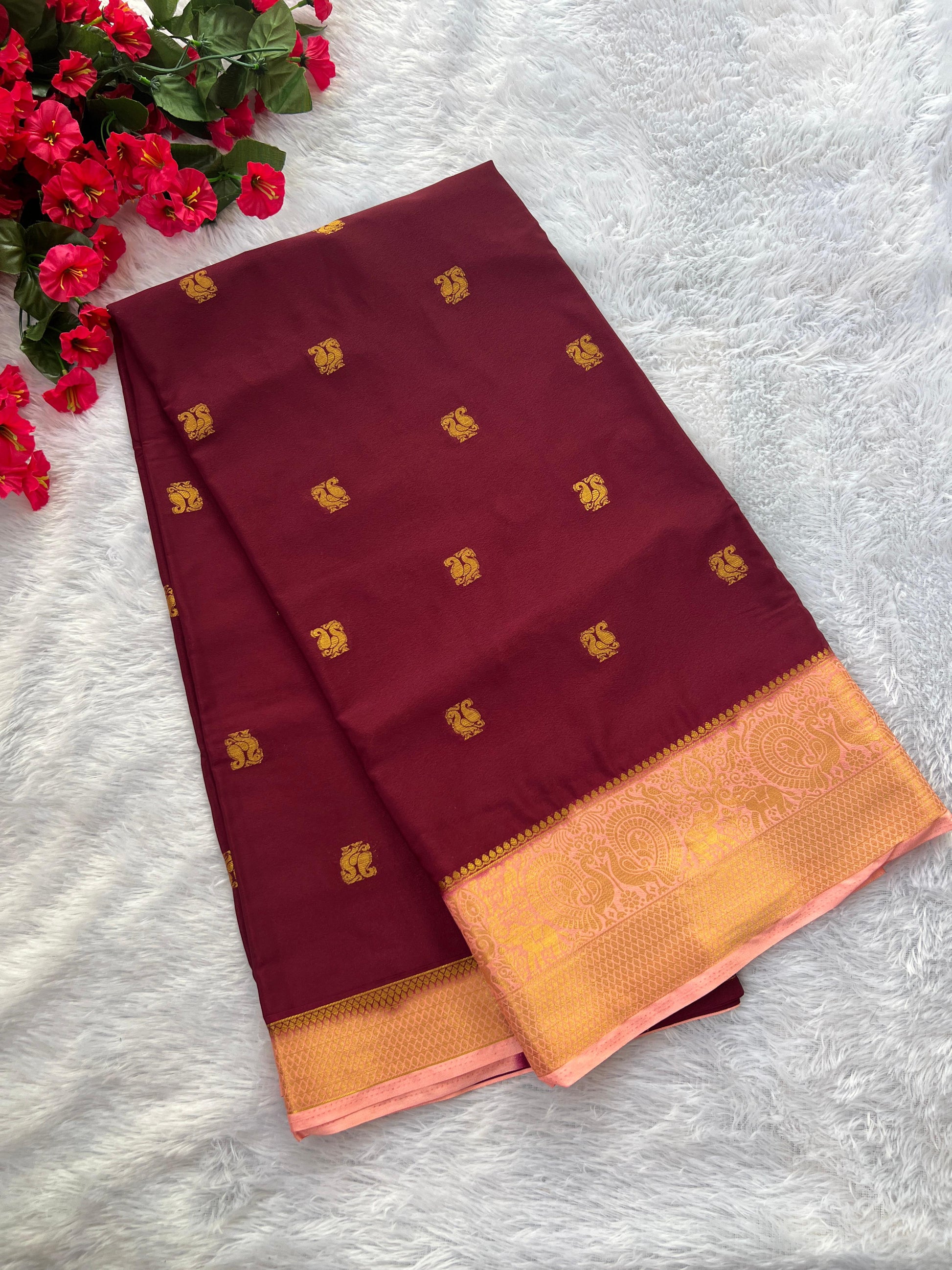 Gracefully crafted in premium semi Mysore silk, this saree features exquisite peacock butta motifs woven across the body, symbolizing timeless elegance. It is beautifully complemented by a medium-width border that enhances its rich appeal. The saree is finished with a traditional chit pallu, adding a classic South Indian charm. Soft, lightweight, and comfortable to drape, it is perfect for festive occasions, temple visits, and special gatherings.