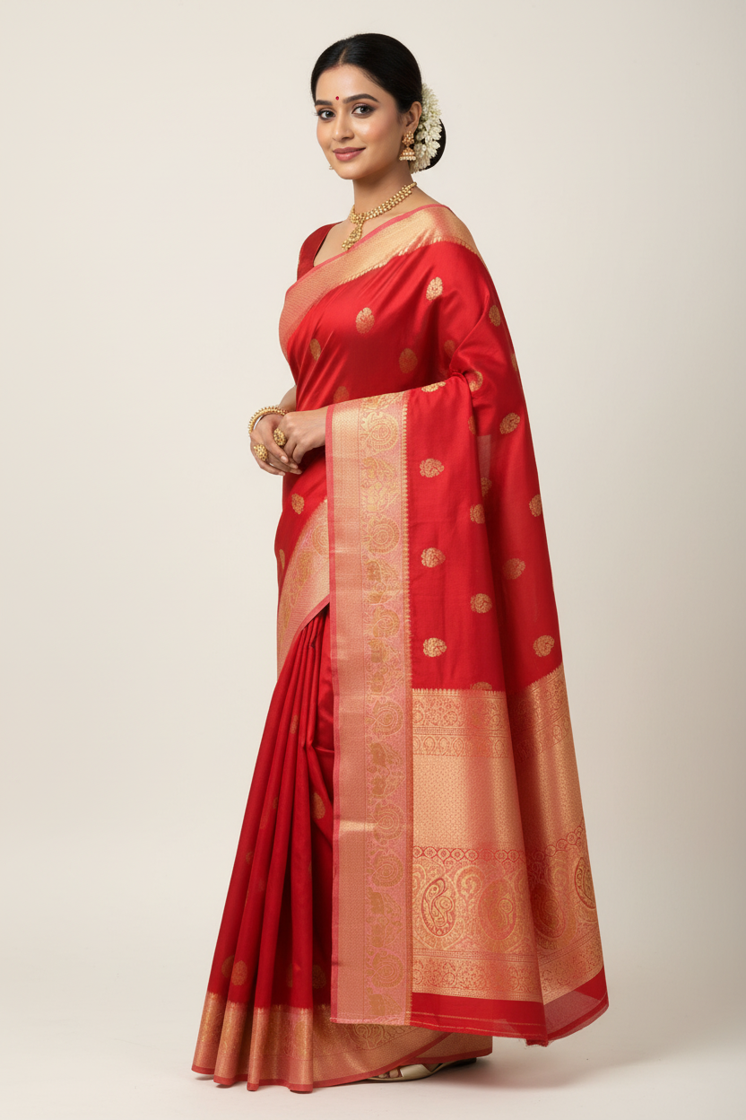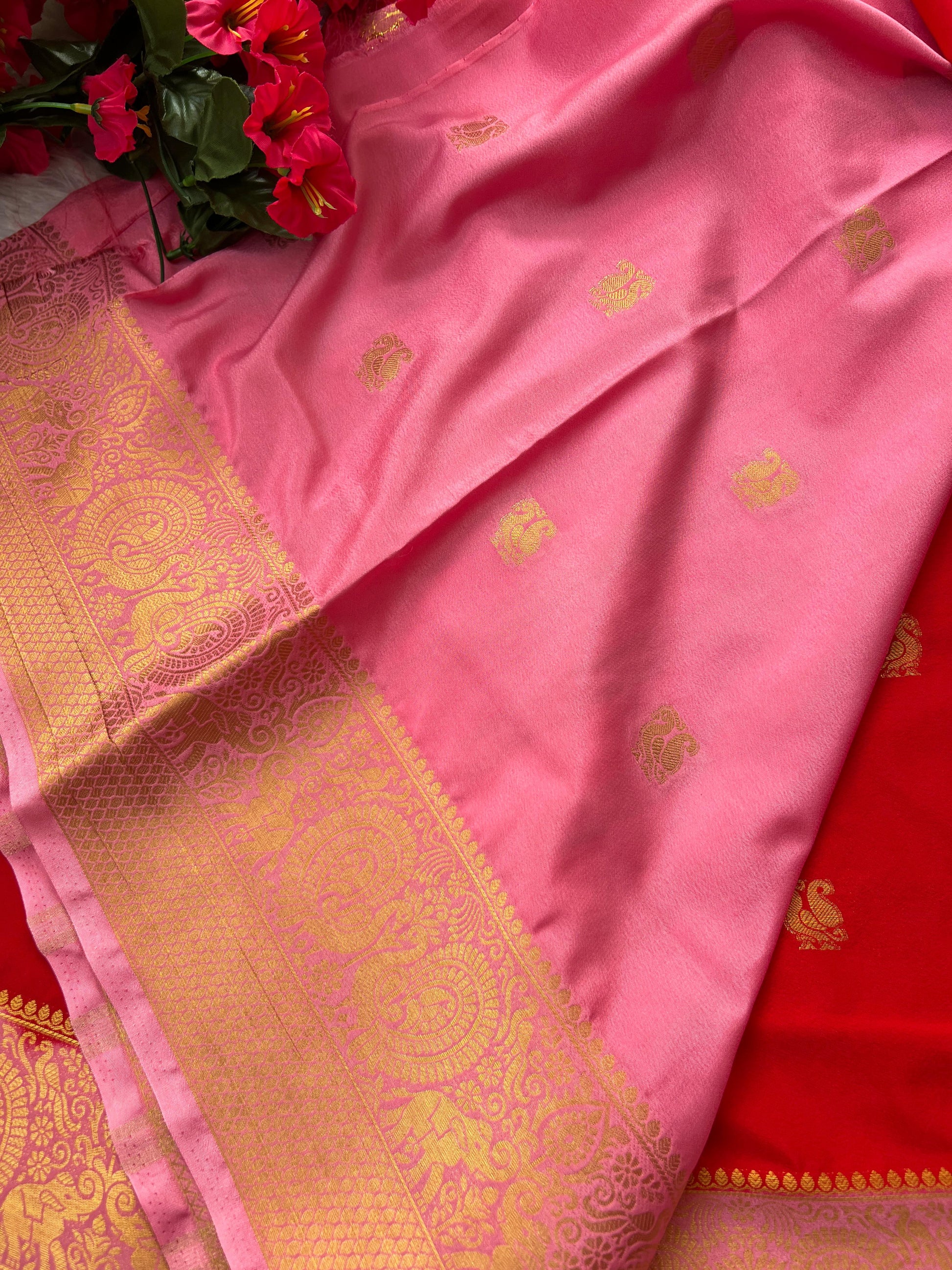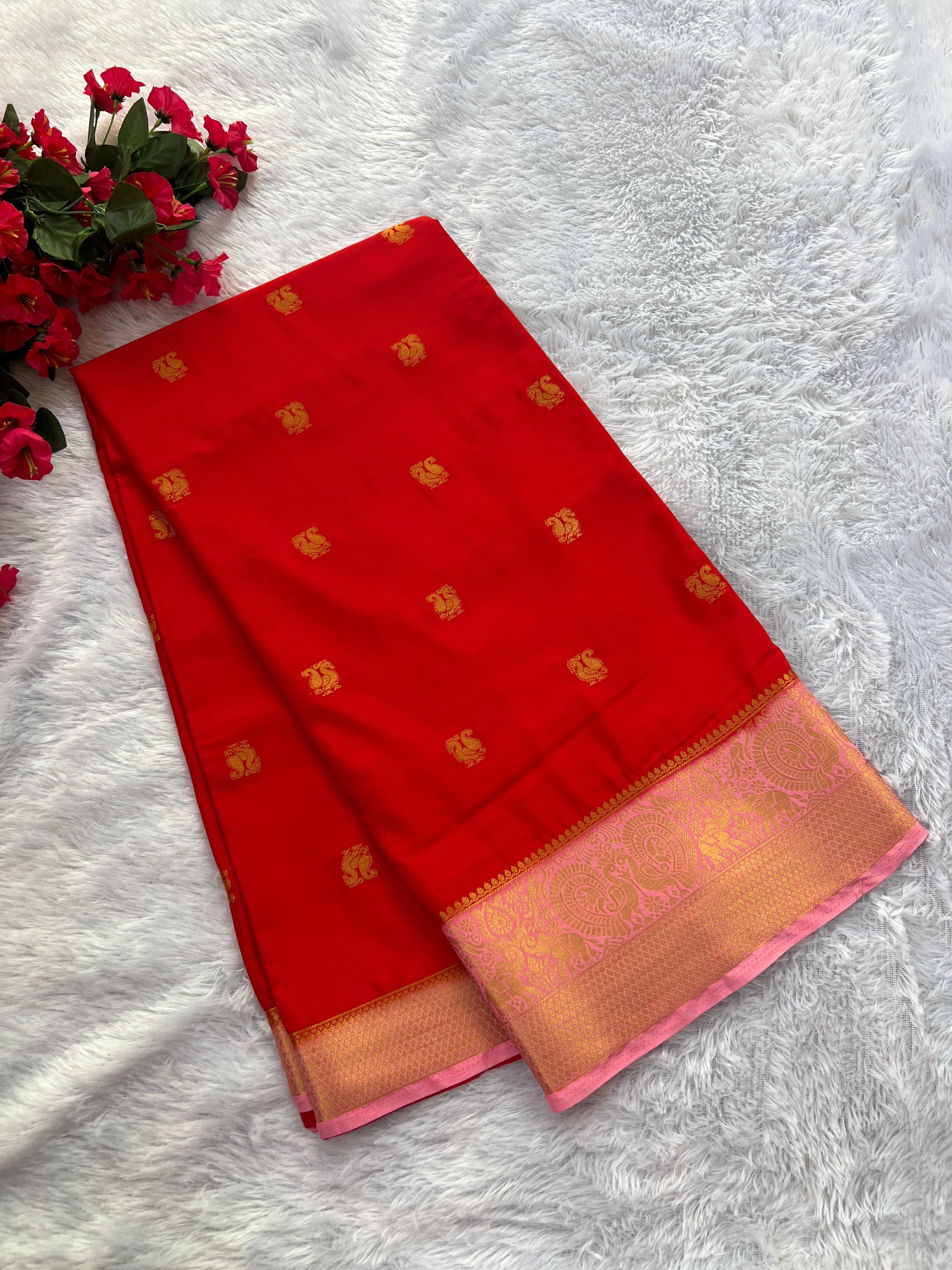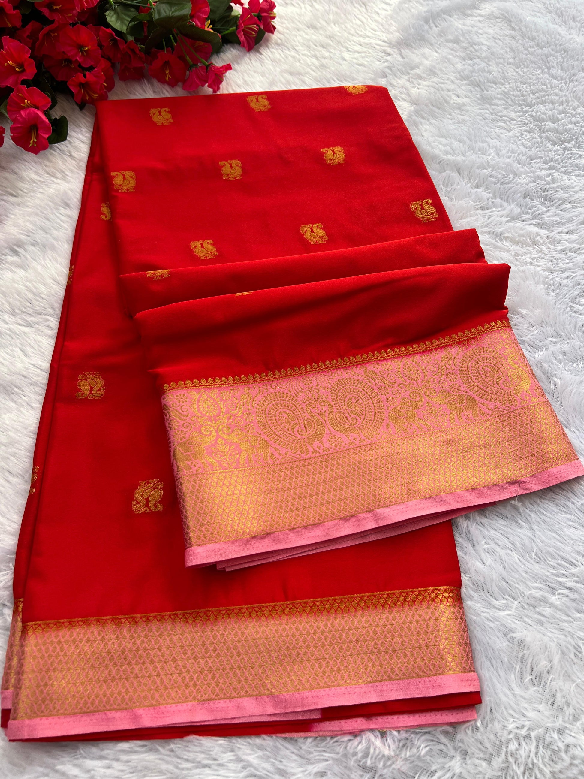 Gracefully crafted in premium semi Mysore silk, this saree features exquisite peacock butta motifs woven across the body, symbolizing timeless elegance. It is beautifully complemented by a medium-width border that enhances its rich appeal. The saree is finished with a traditional chit pallu, adding a classic South Indian charm. Soft, lightweight, and comfortable to drape, it is perfect for festive occasions, temple visits, and special gatherings.