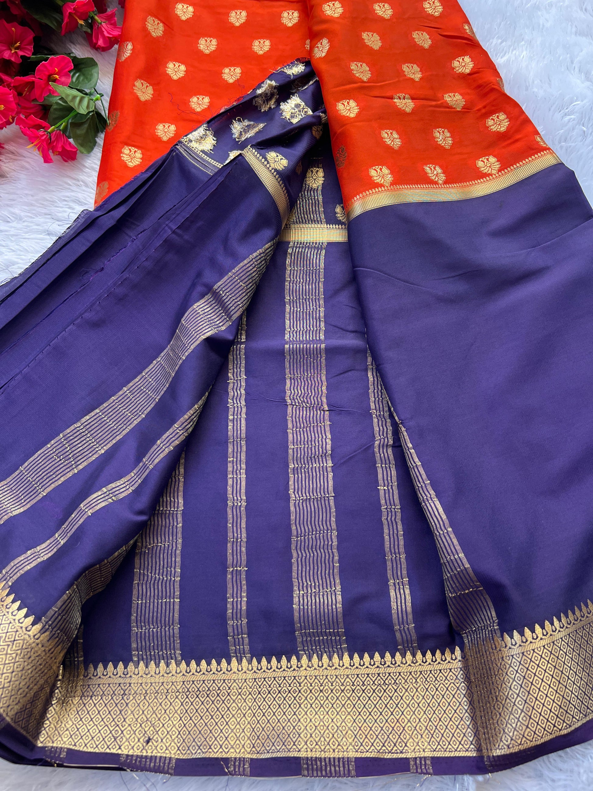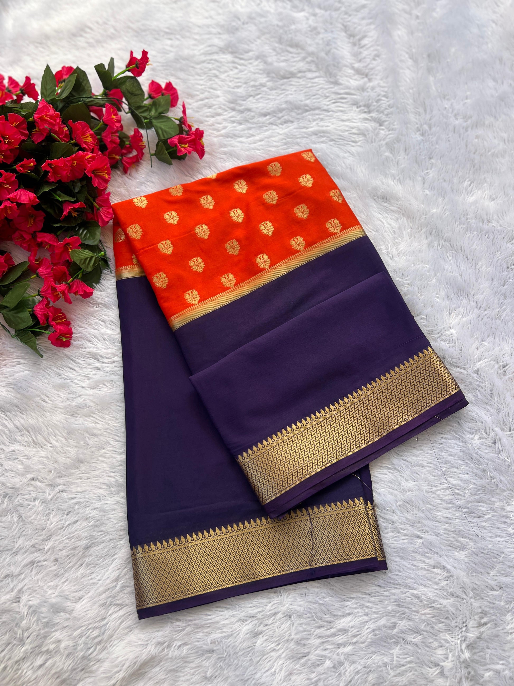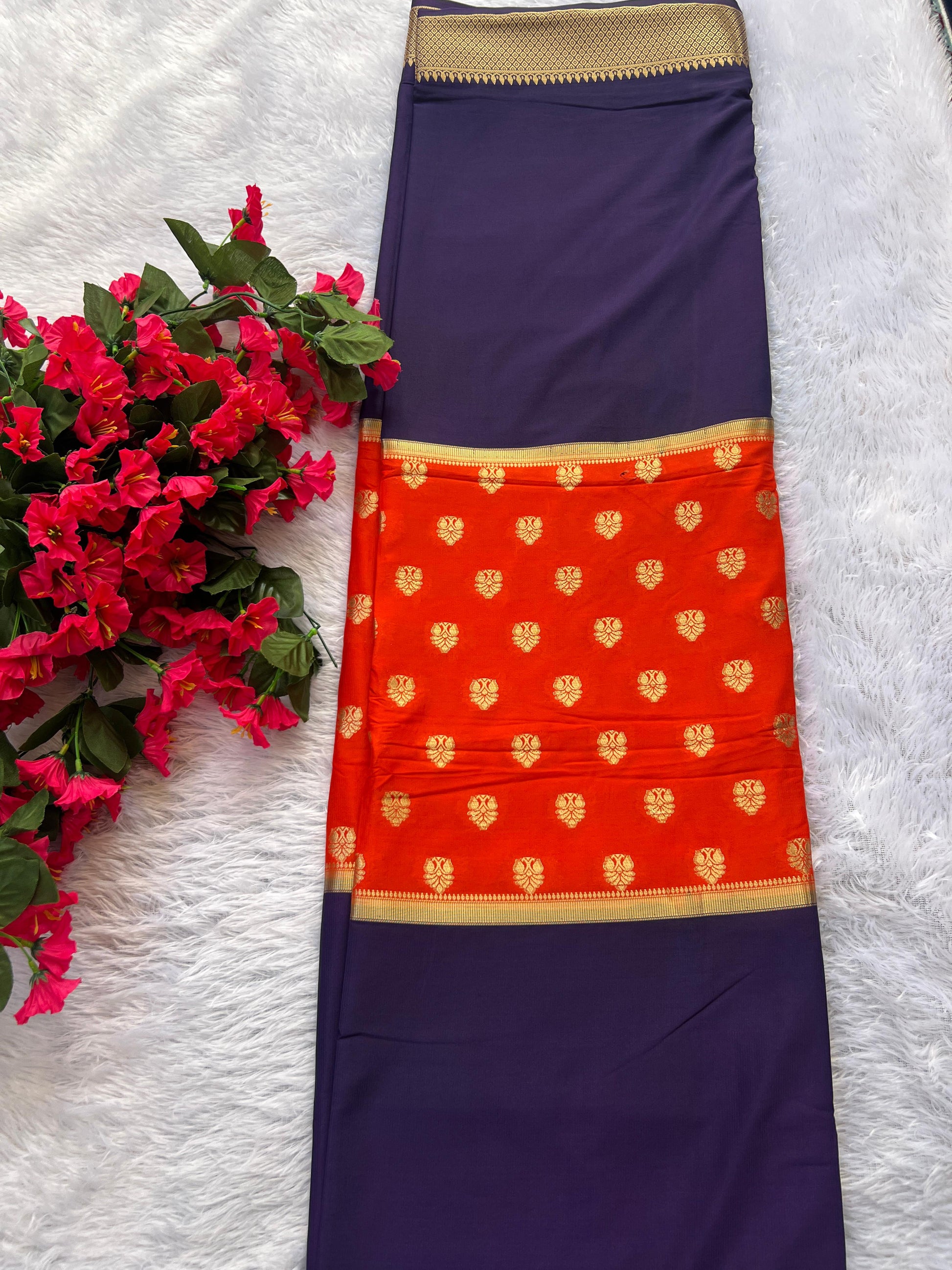 Semi Mysore Silk Saree in an elegant 2D pattern, beautifully highlighted with delicate middle butta motifs that add a subtle charm to the overall look. The saree comes paired with a rich purple blouse that perfectly complements the design, making it ideal for festive wear, weddings, and special occasions. Crafted with a soft, smooth texture, it offers both comfort and graceful drape.