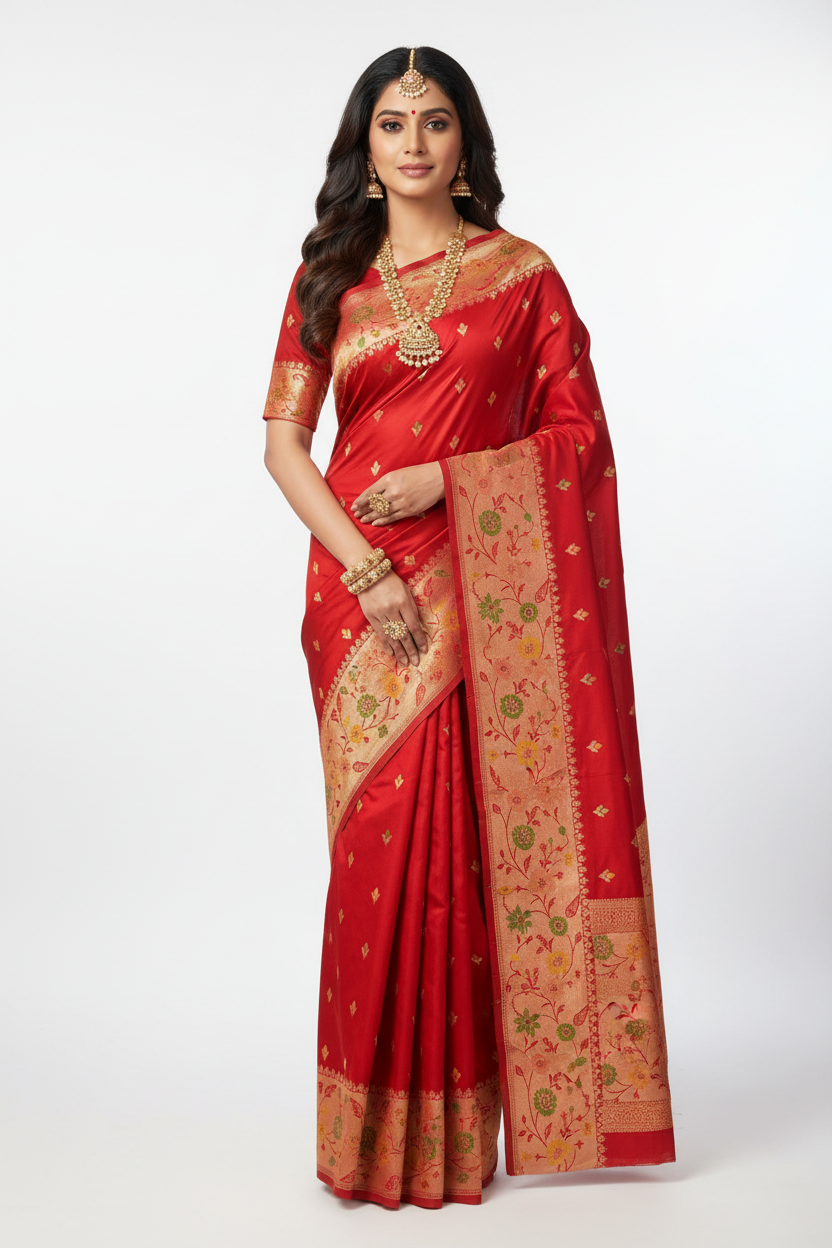 Semi-Dola Silk Saree crafted in an elegant self-design, beautifully adorned with a German silver zari woven border that adds a subtle yet luxurious charm. The saree features a richly woven pallu, enhancing its graceful and premium appeal. It comes with a matching self blouse, perfectly complementing the saree’s overall look. Soft, lightweight, and comfortable to wear, this saree is ideal for festive occasions and special gatherings.