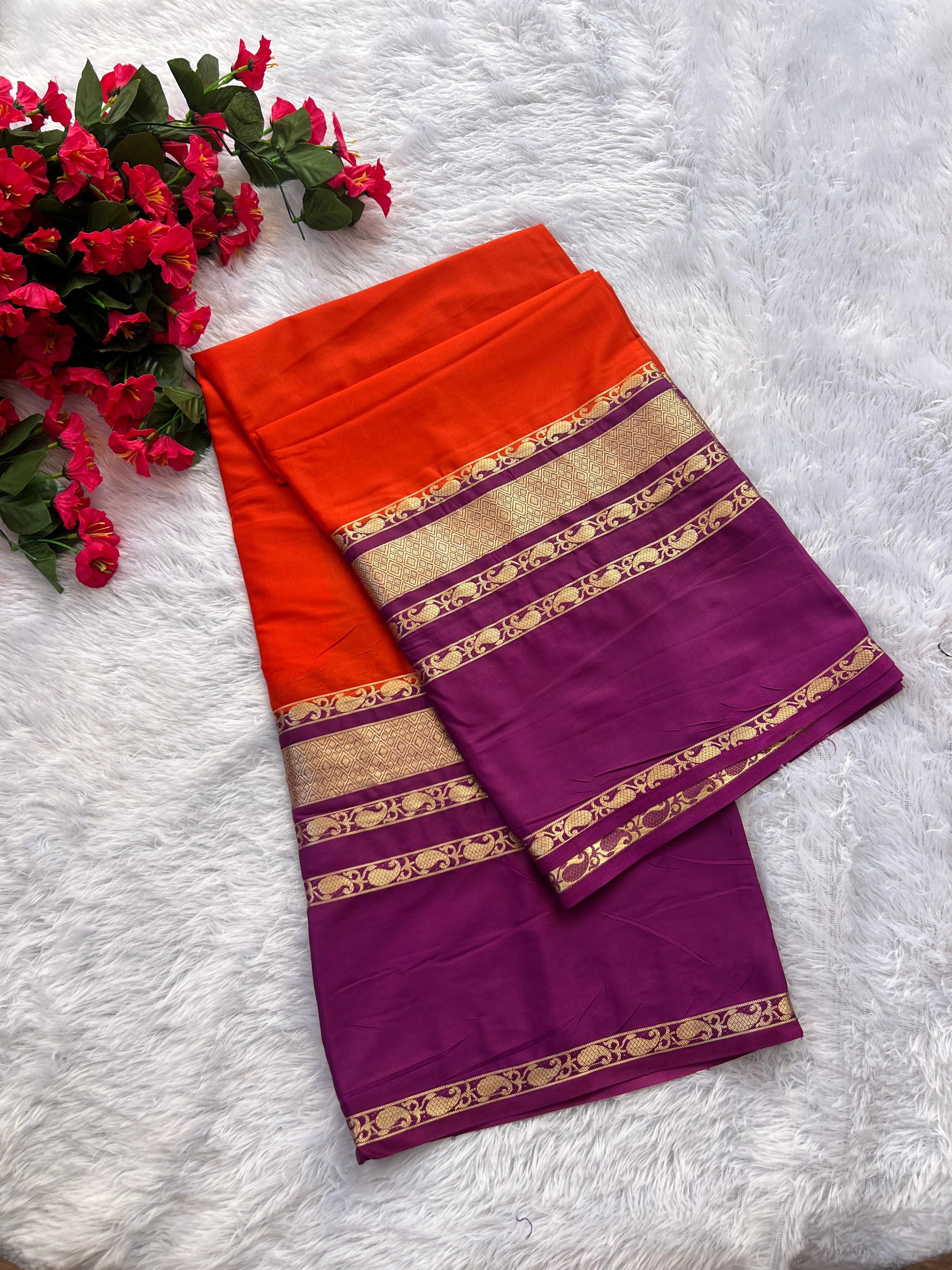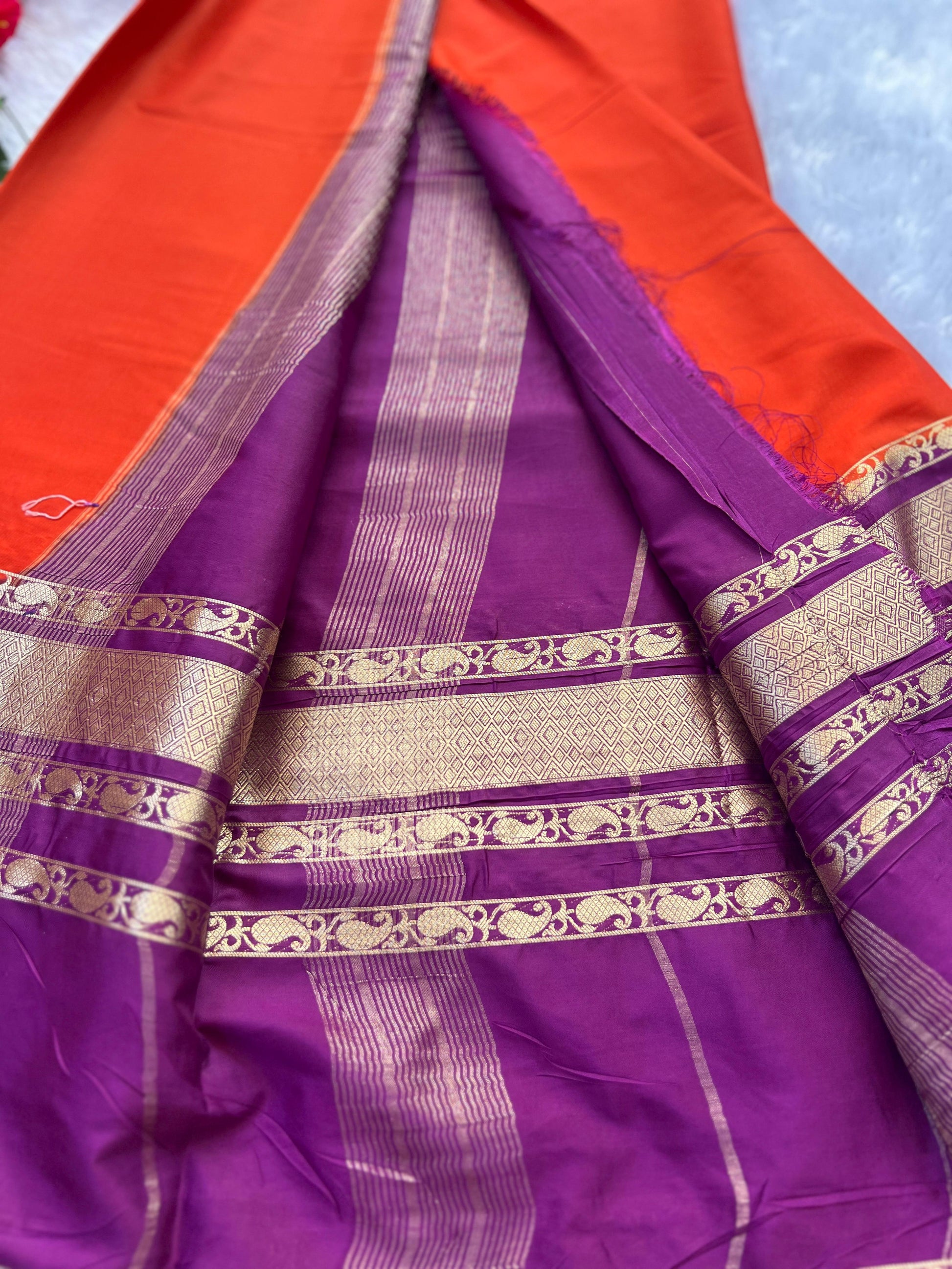 Semi Mysore Silk 4-Line Mango Bentex Saree comes in a stunning blend of powder shade with beautiful orange and purple tones. Crafted from soft and fluffy material, this saree offers unmatched comfort and a graceful fall, making it extremely easy to wear for long hours. The charming mango bentex design with elegant four-line detailing adds a traditional yet trendy touch, perfect for weddings, festive occasions, and temple visits. Lightweight and breathable, it gives you a rich look without compromising on comfort.